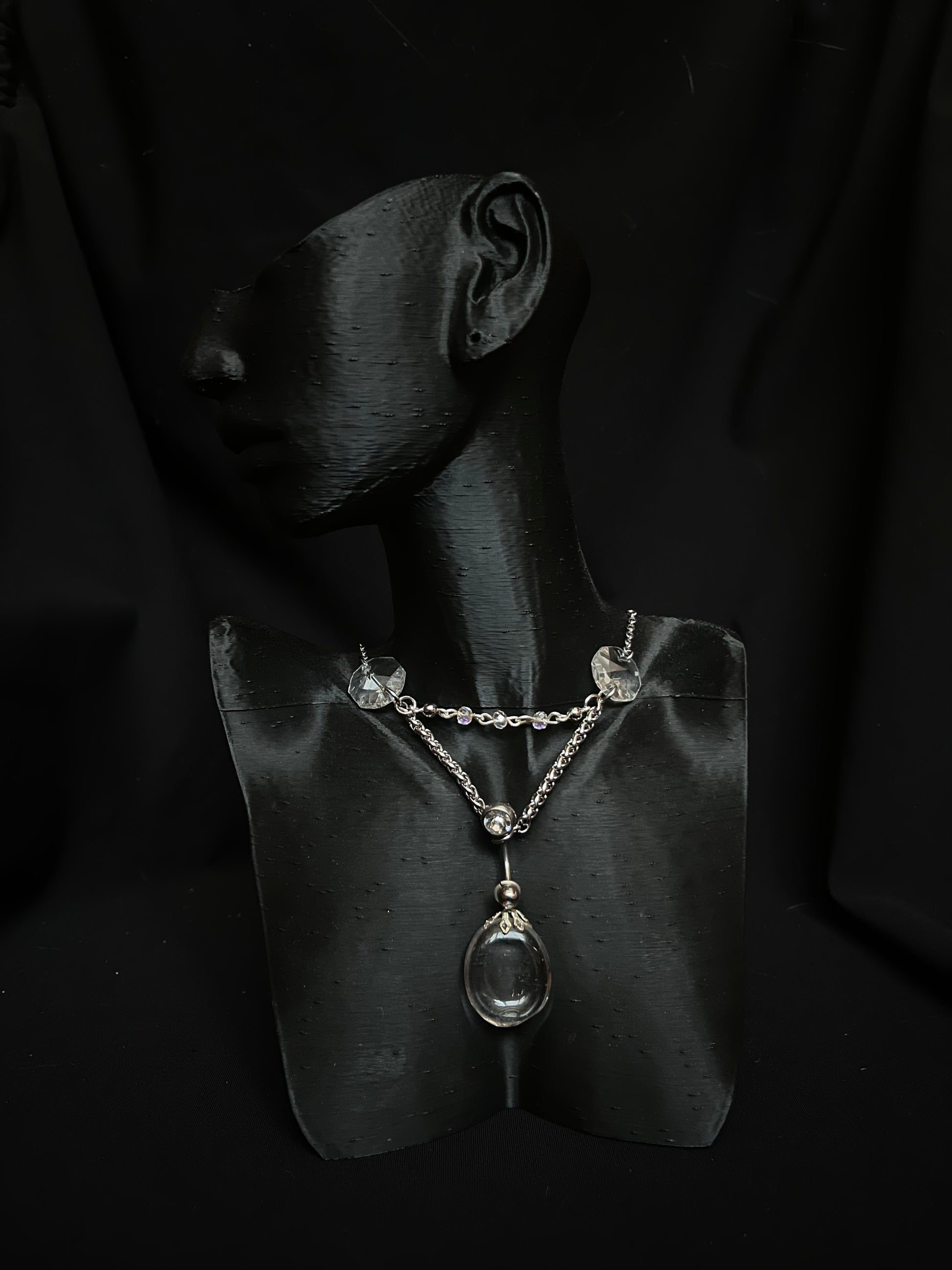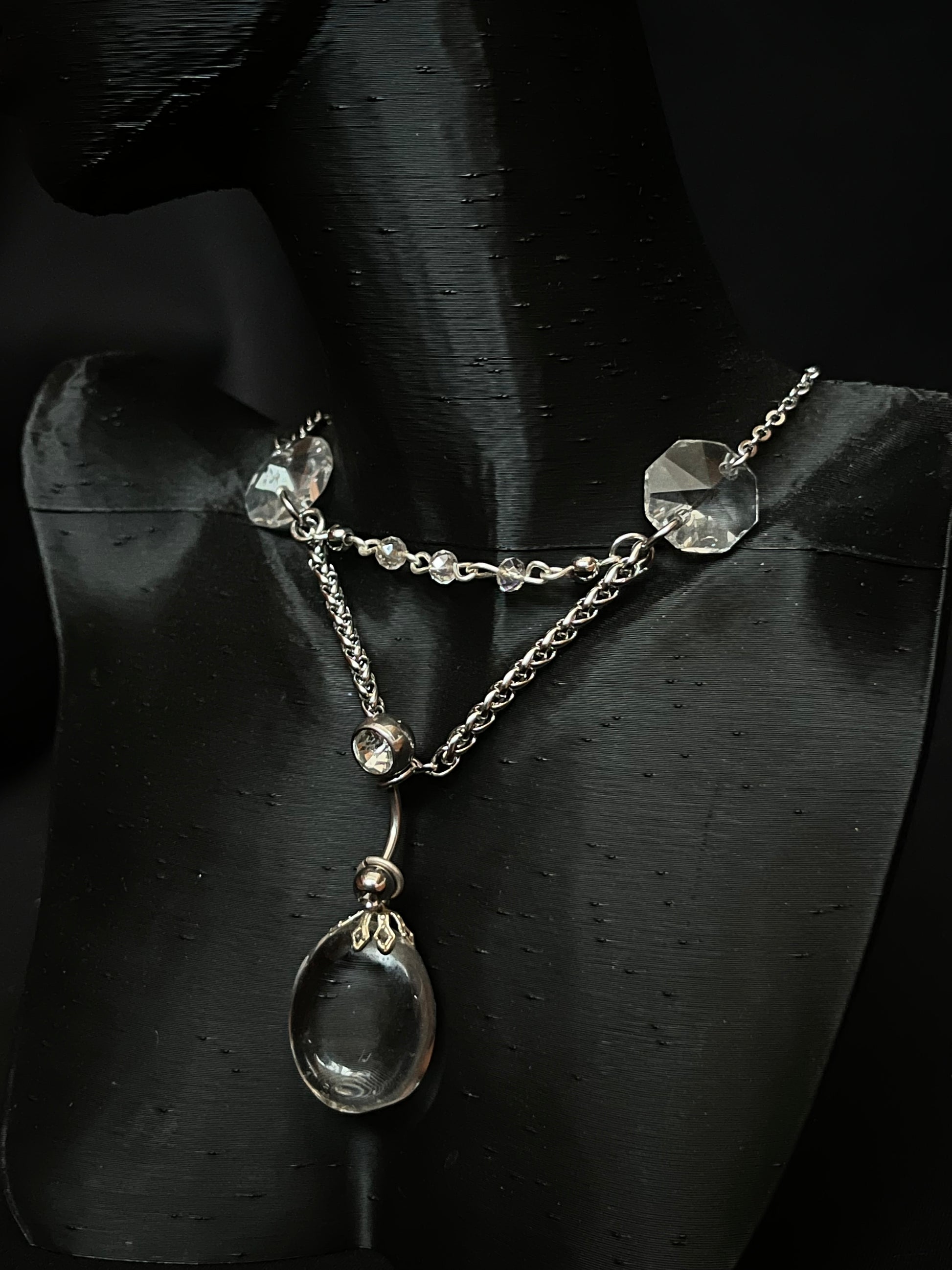Deux médaillons facettés viennent illuminer la base du cou, tandis qu’un délicat enchaînement de cristaux relie l’ensemble avec subtilité. Au centre, un pendentif goutte en verre, suspendu à une tige ornée d’un cabochon de cristal, vient parfaire cette pièce élégante et intrigante, rappelant la douceur d’une larme figée dans le temps.