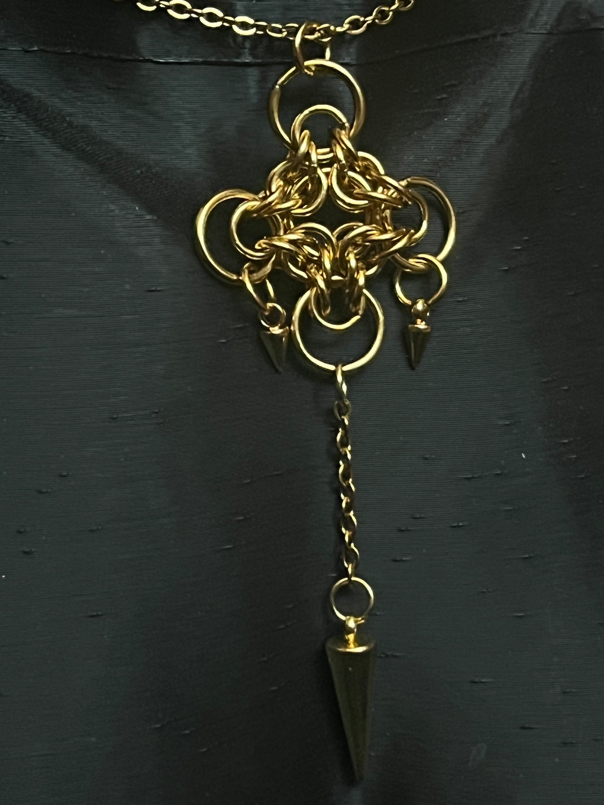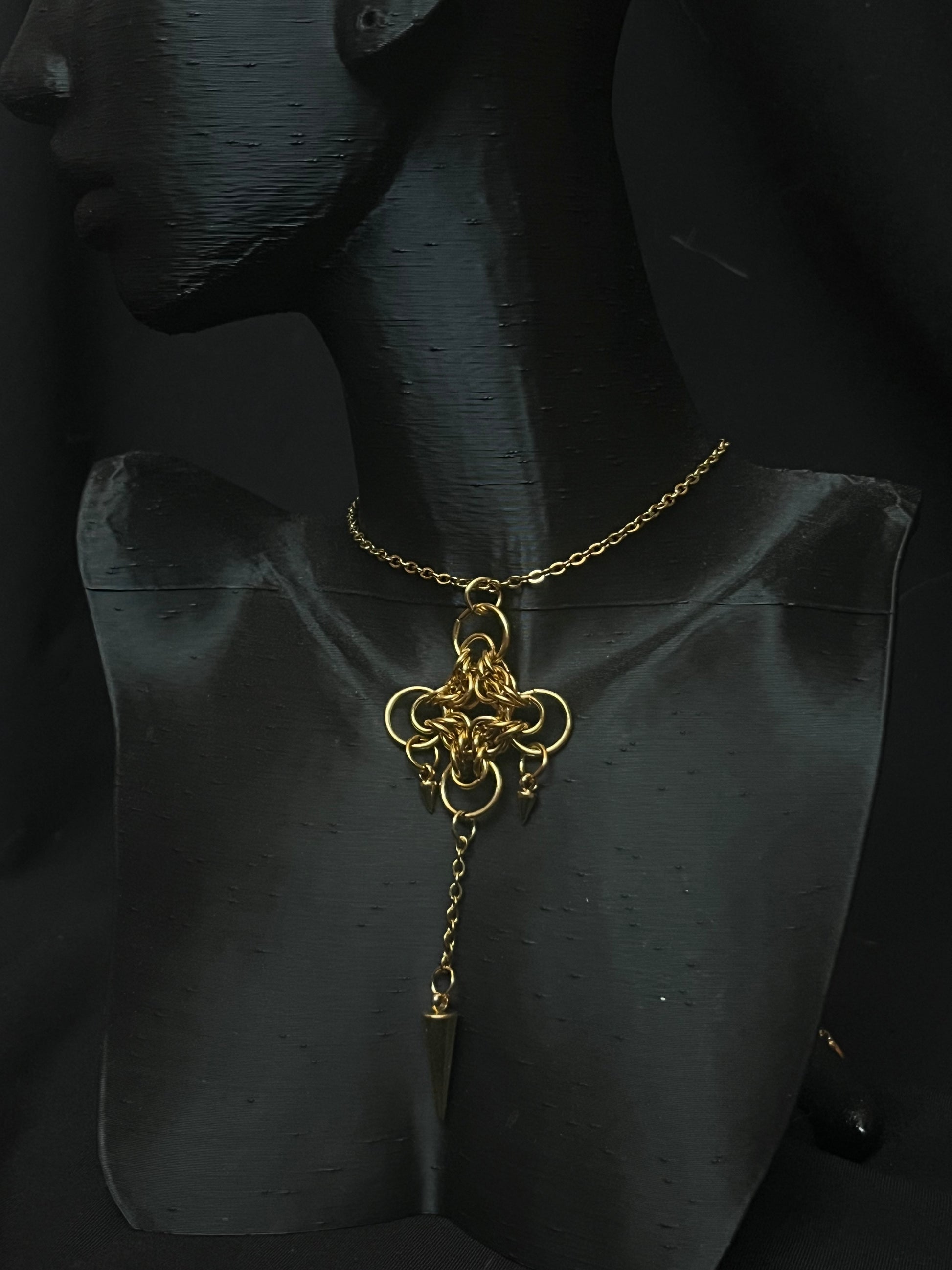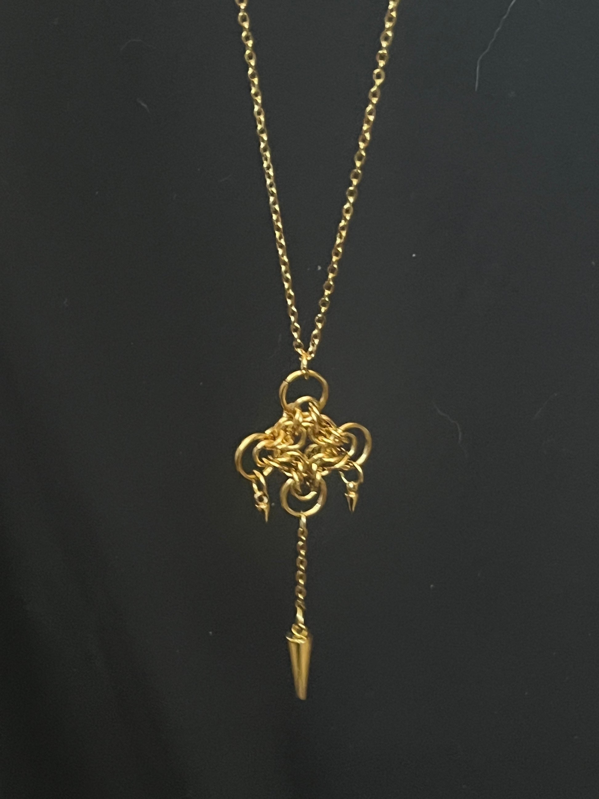 Entièrement en acier inoxydable, il arbore un pendentif structuré en assemblage de maillons et d’anneaux entrelacés, créant un effet de chaos maîtrisé. Trois pointes métalliques viennent accentuer son esthétique brute et rebelle, tandis qu’une fine chaîne pendante ajoute une touche de mouvement et de sophistication.