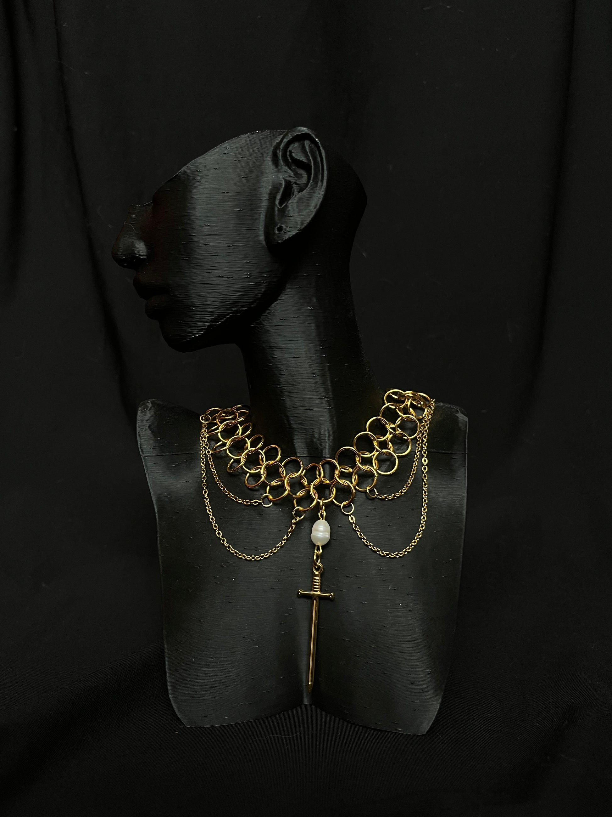 Le Lord of the Th0ts est un collier imposant mêlant la robustesse de l’acier inoxydable à la finesse d’une perle d’eau douce. Son enchevêtrement de maillons et de chaines évoque une parure d’antan, tandis que l’épée suspendue en son centre symbolise puissance et audace. Inspiré par l’univers épique de la fantasy et l’identité unique de Th0tiris, ce bijou incarne le style et la prestance de ceux qui osent régner sur leur propre royaume.
