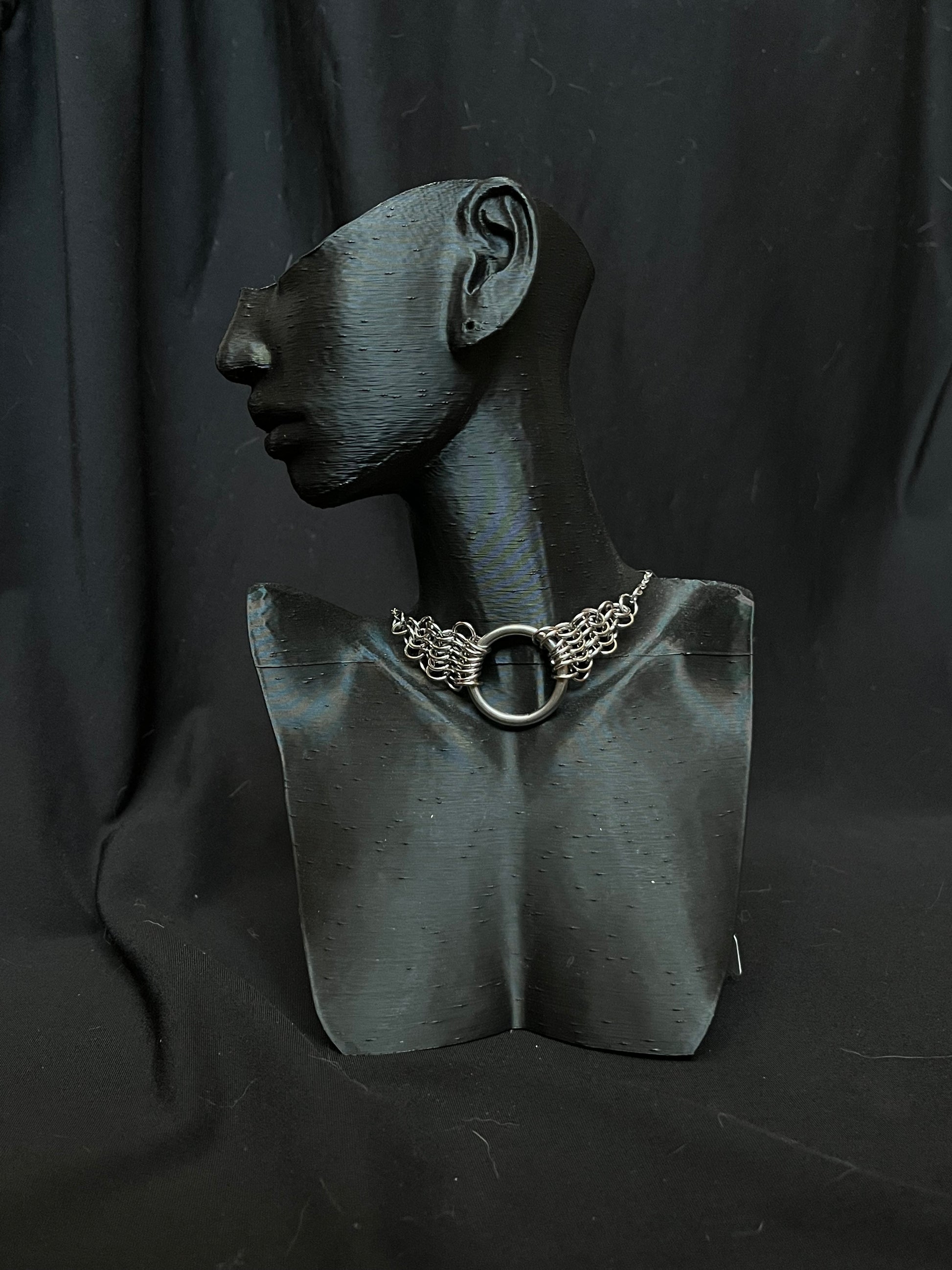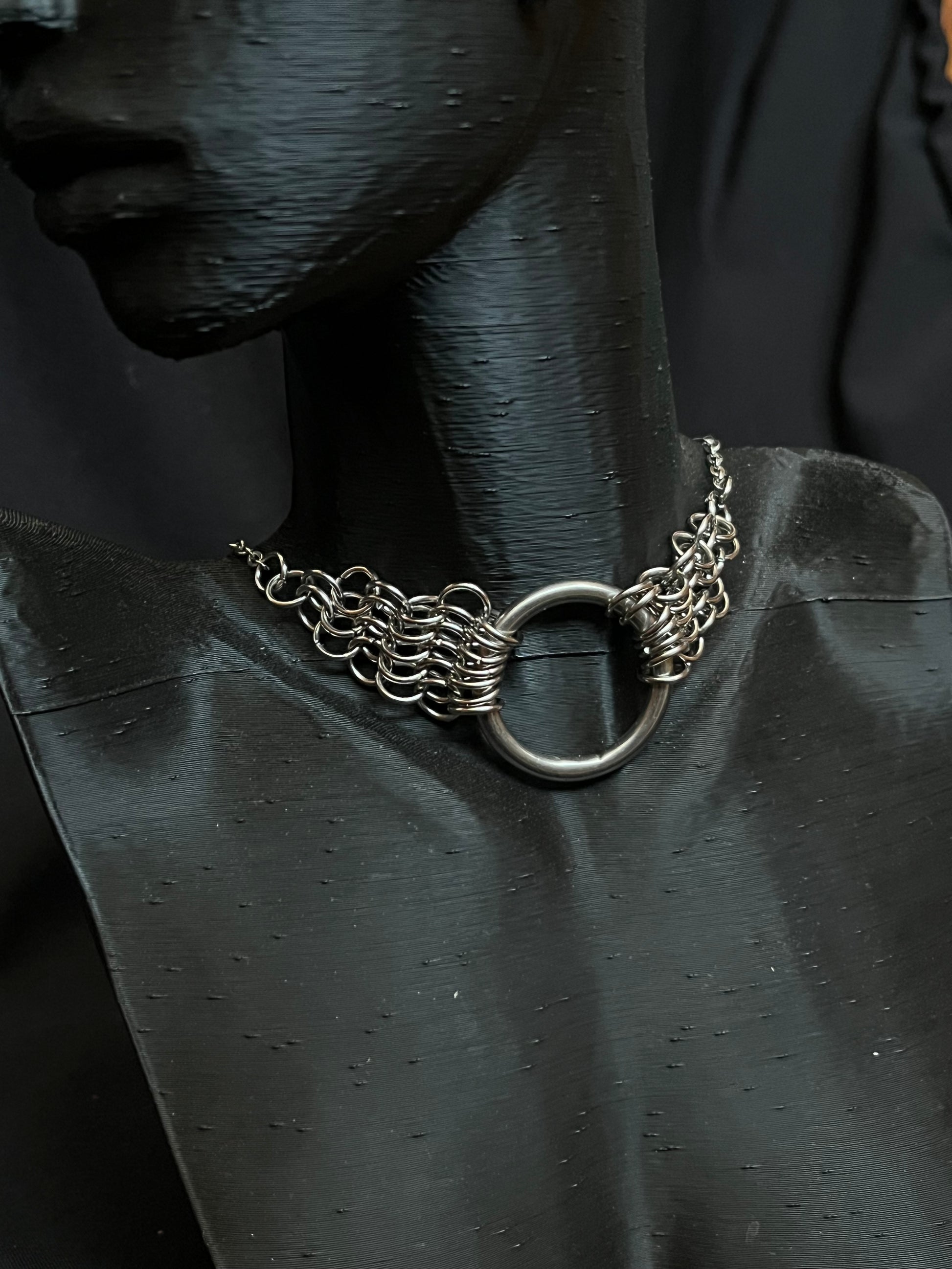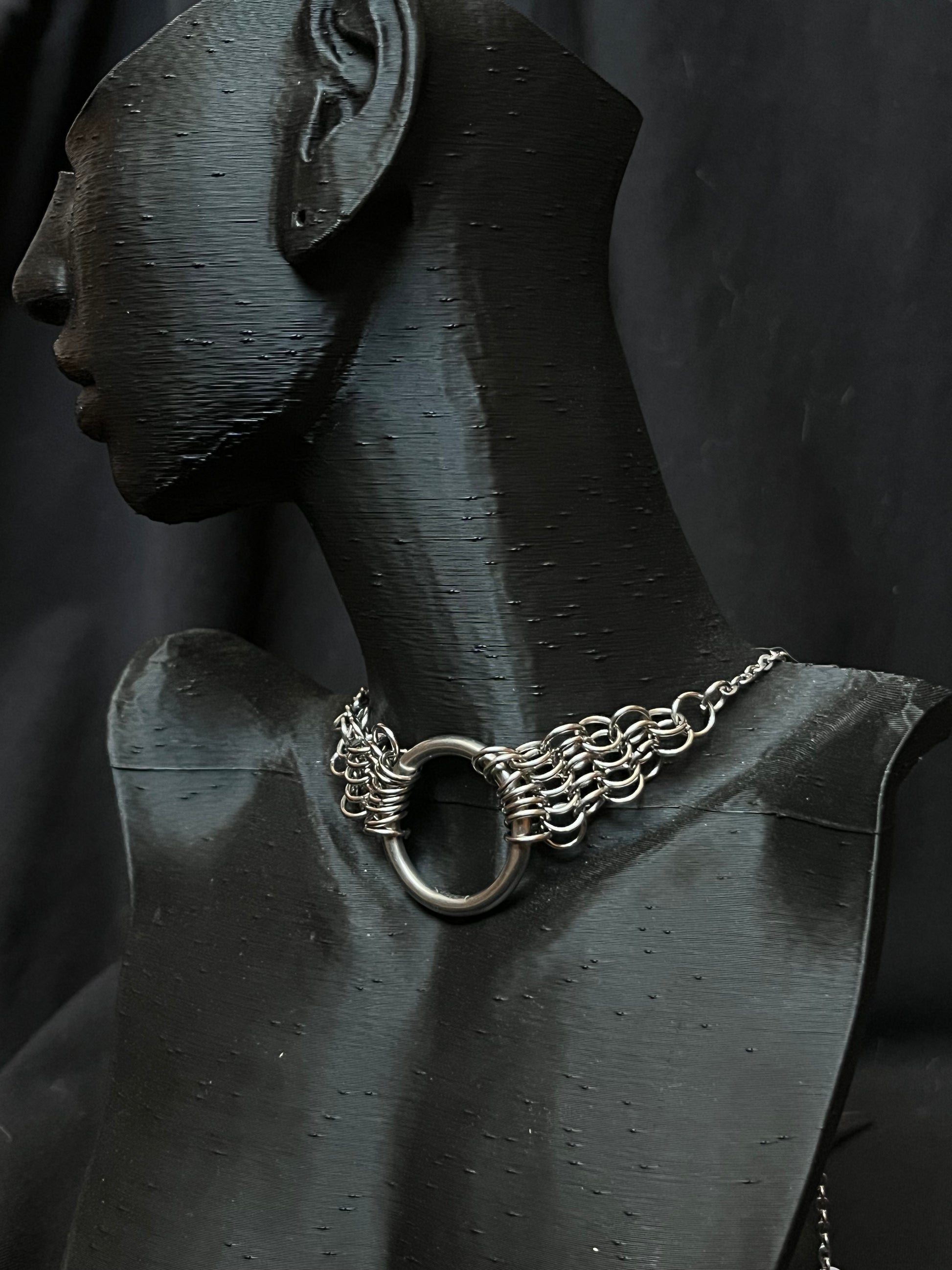 Le Smaug necklace est un choker rappelant l’armure d’écaille du célèbre dragon du Seigneur des anneaux. Il est conçu par un entrelacement d’anneau entourant un plus grand anneau central. Entièrement en acier inoxydable, il se termine par une chaîne fine entourant le cou.