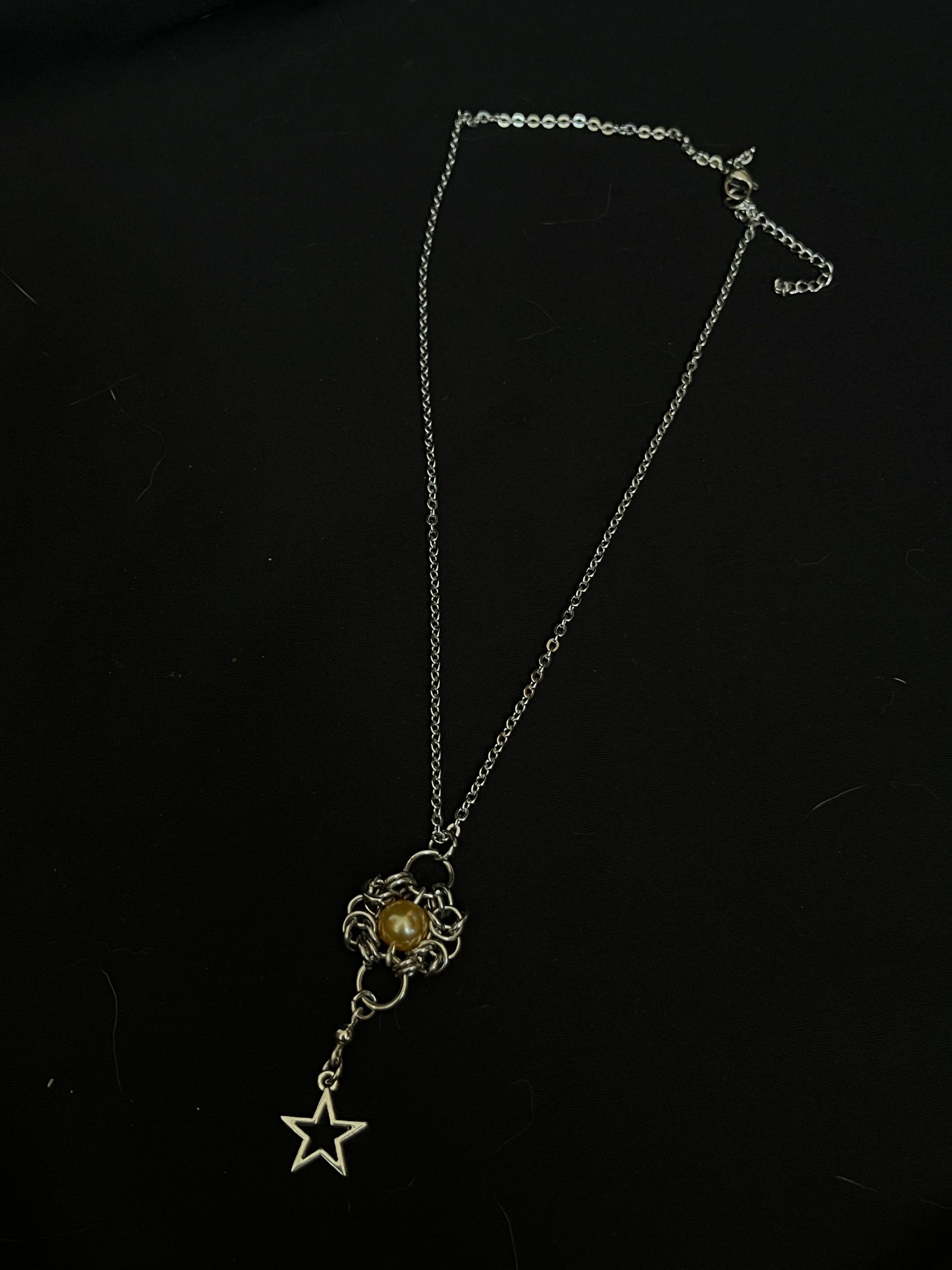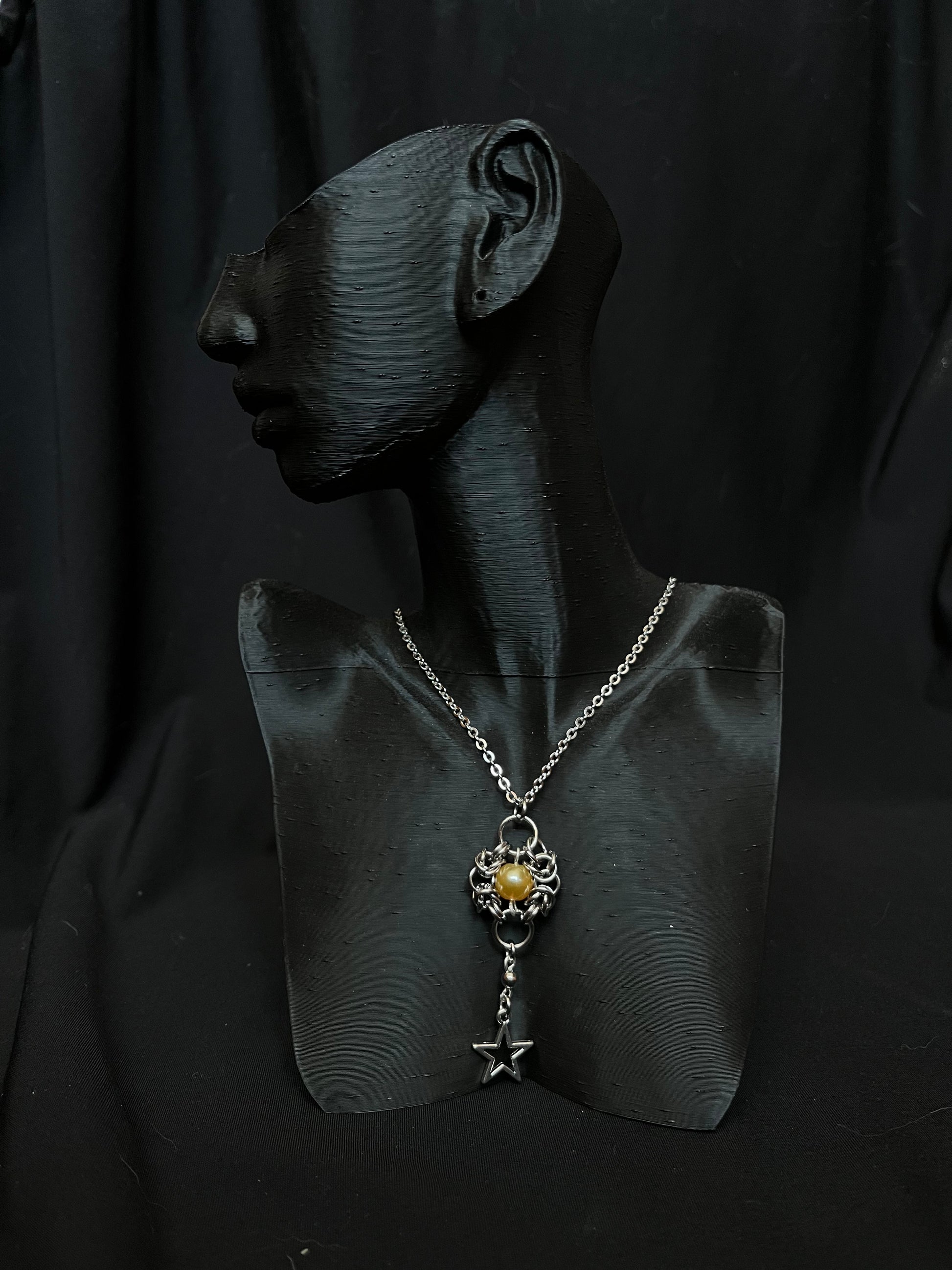 Le Solar Necklace est un collier en acier inoxydable orné d’une perle jaune en verre entourée d’un maillage fin, dont est suspendue une petite étoile rappelant la nature du soleil.