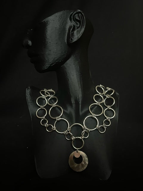Le Dark Rainbow Choker est un collier audacieux, conçu pour épouser parfaitement le cou avec ses mailles en gros anneaux en acier, créant un effet à la fois moderne et élégant. Son pendentif noir nacré, mystérieux et captivant, révèle subtilement des teintes colorées à la lumière, ajoutant une touche magique et changeante.