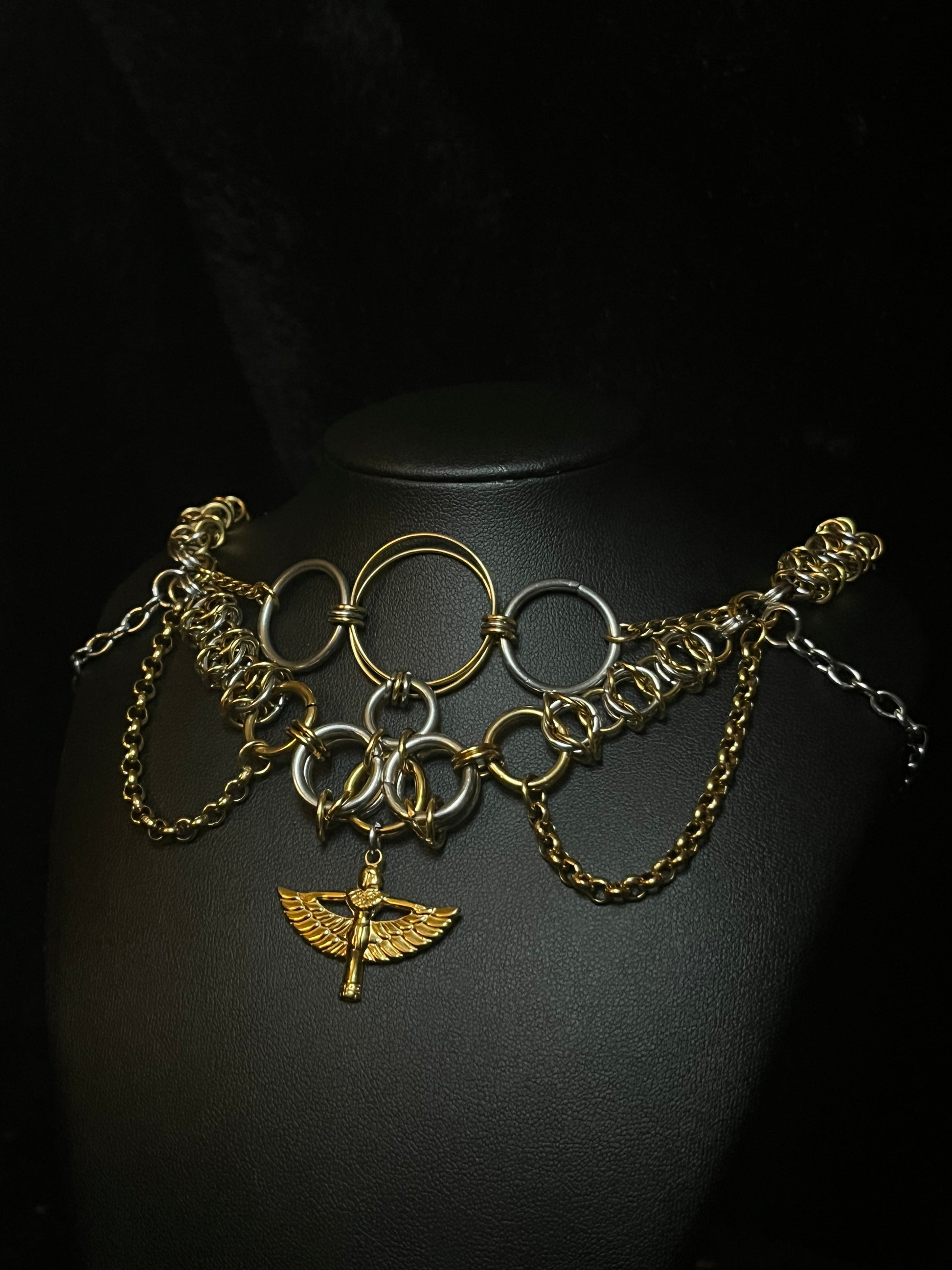 Au centre, le pendentif Isis, ailes déployées. Symbole de protection, de puissance et de renaissance.