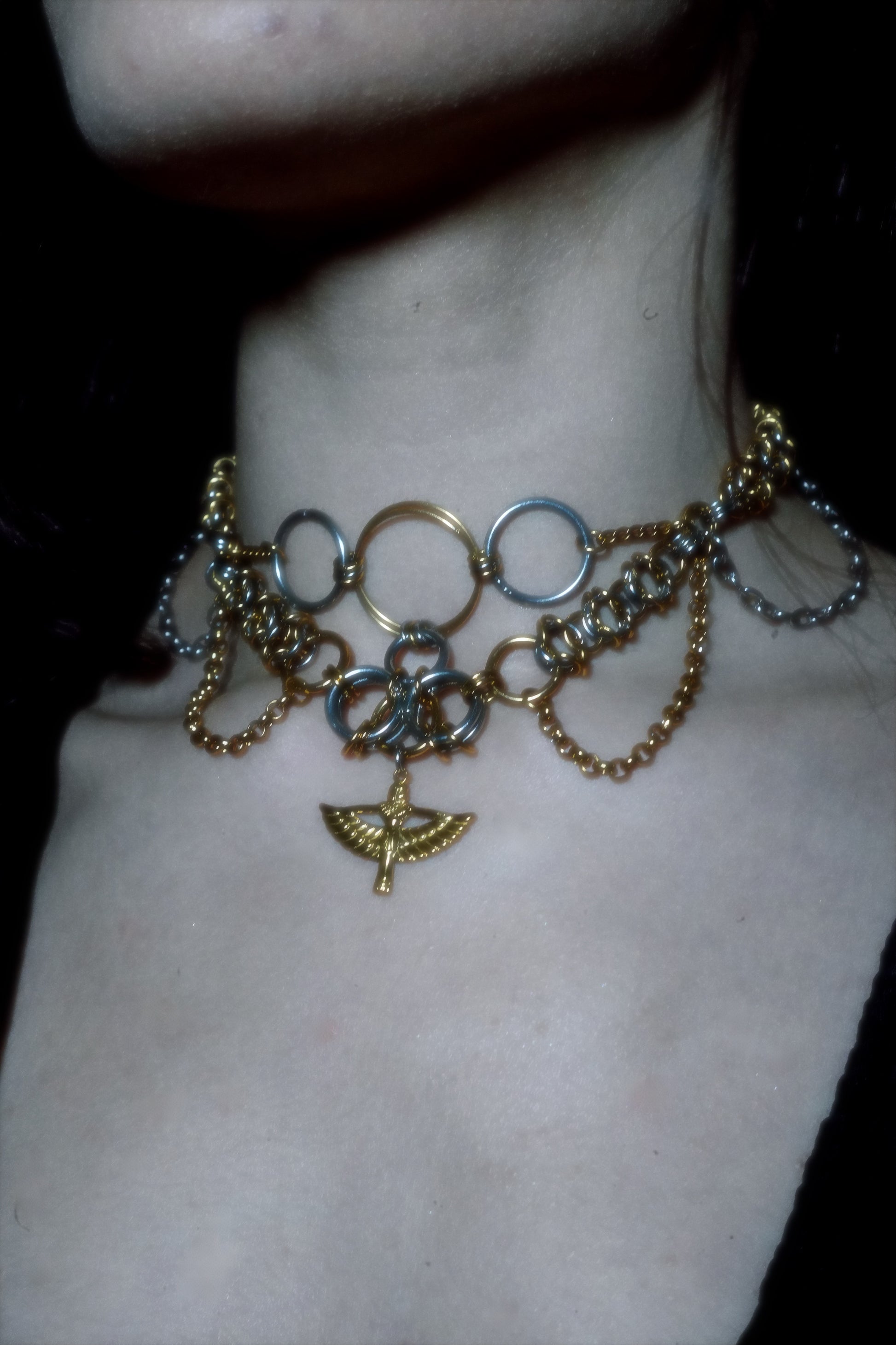 Un collier non genré, entièrement en acier inoxydable doré et argenté, où les anneaux de différentes tailles s’assemblent comme une architecture sacrée.
