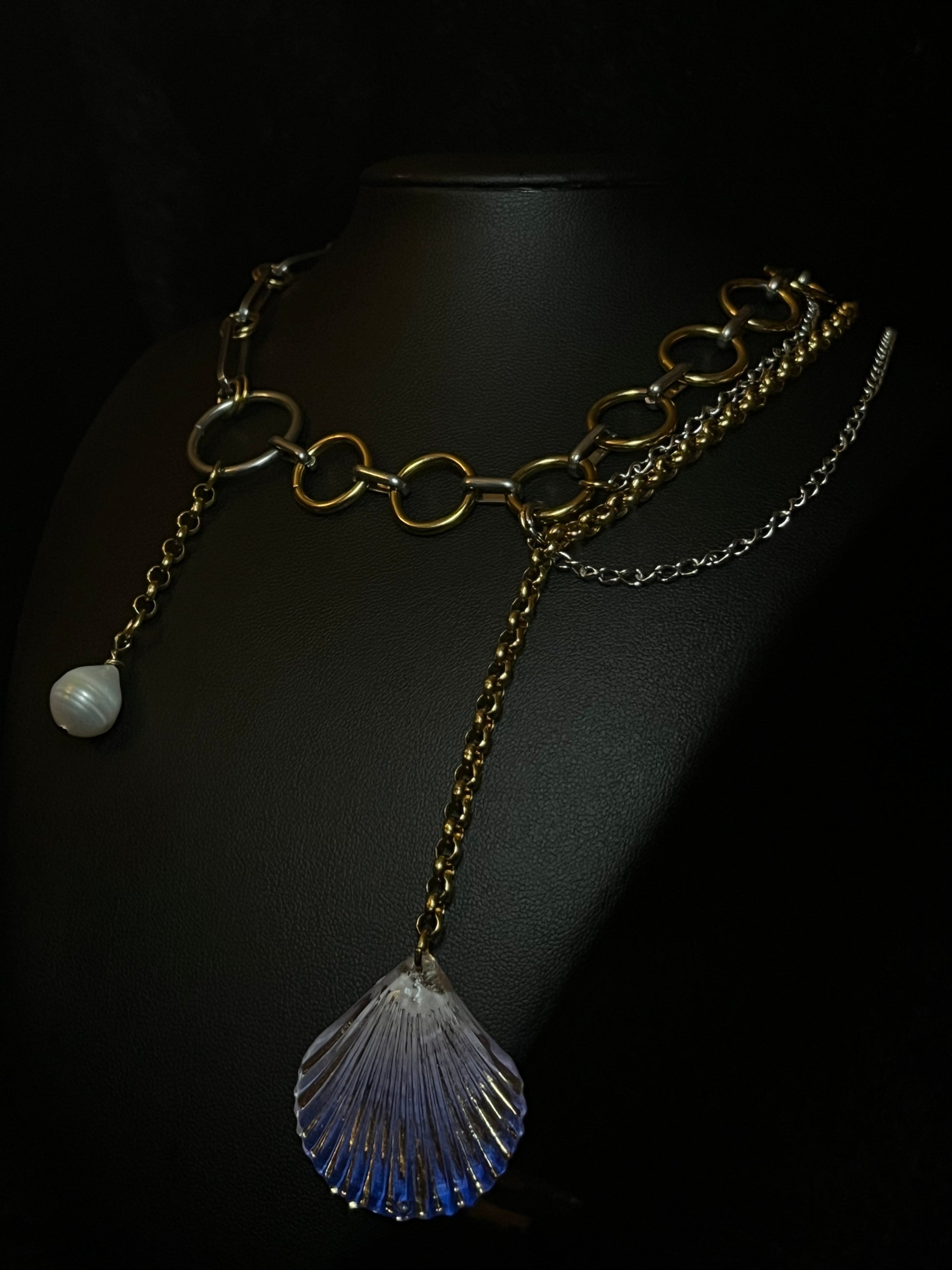 Son coquillage violet en résine, irisé et presque surnaturel, capte la lumière comme un vestige arraché à l’océan. Une perle de culture y pend, fragile et précieuse, comme un secret qu’on ne montre pas à tout le monde.