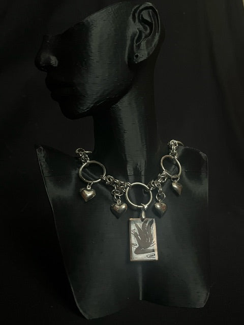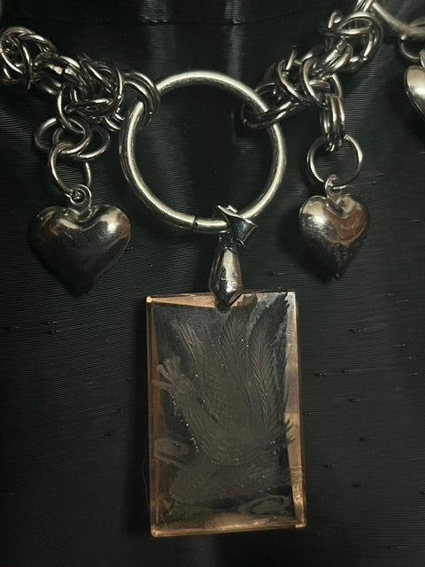 Composé d’une maille argentée en acier inoxydable et agrémenté de gros anneaux, il se distingue par un pendentif rectangulaire rose, chiné au marché, orné d’une gravure de paon finement réalisée. Ce bijou unique allie l’élégance de l’argenté et la touche éclatante du rose, pour un look à la fois raffiné et affirmé.