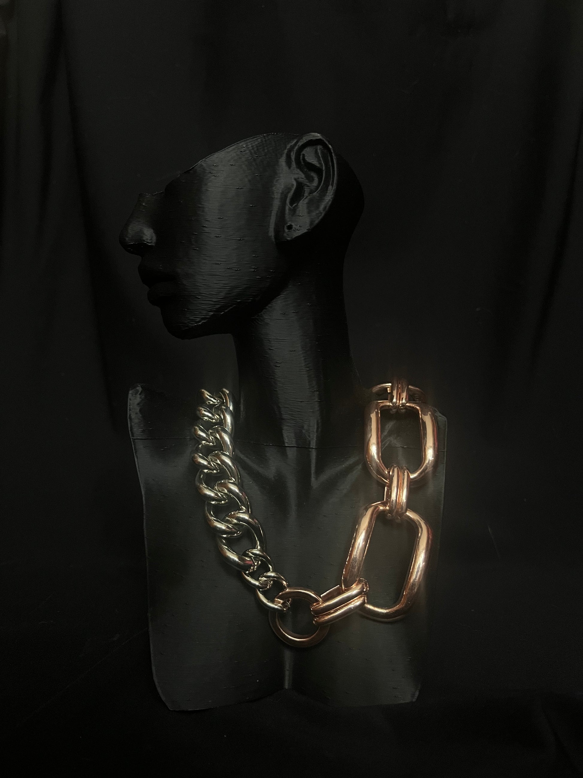 Inspiré de l’univers de Cruella d’Enfer et sa célèbre coiffure bicolore, le Pinky Cruella reprend les codes du premier Cruella Necklace en y ajoutant une touche pinky avec une grosse chaîne au revêtement or rose, complémenté bien évidemment par une chaîne différente de par sa couleur argent et son maillage plus serré.