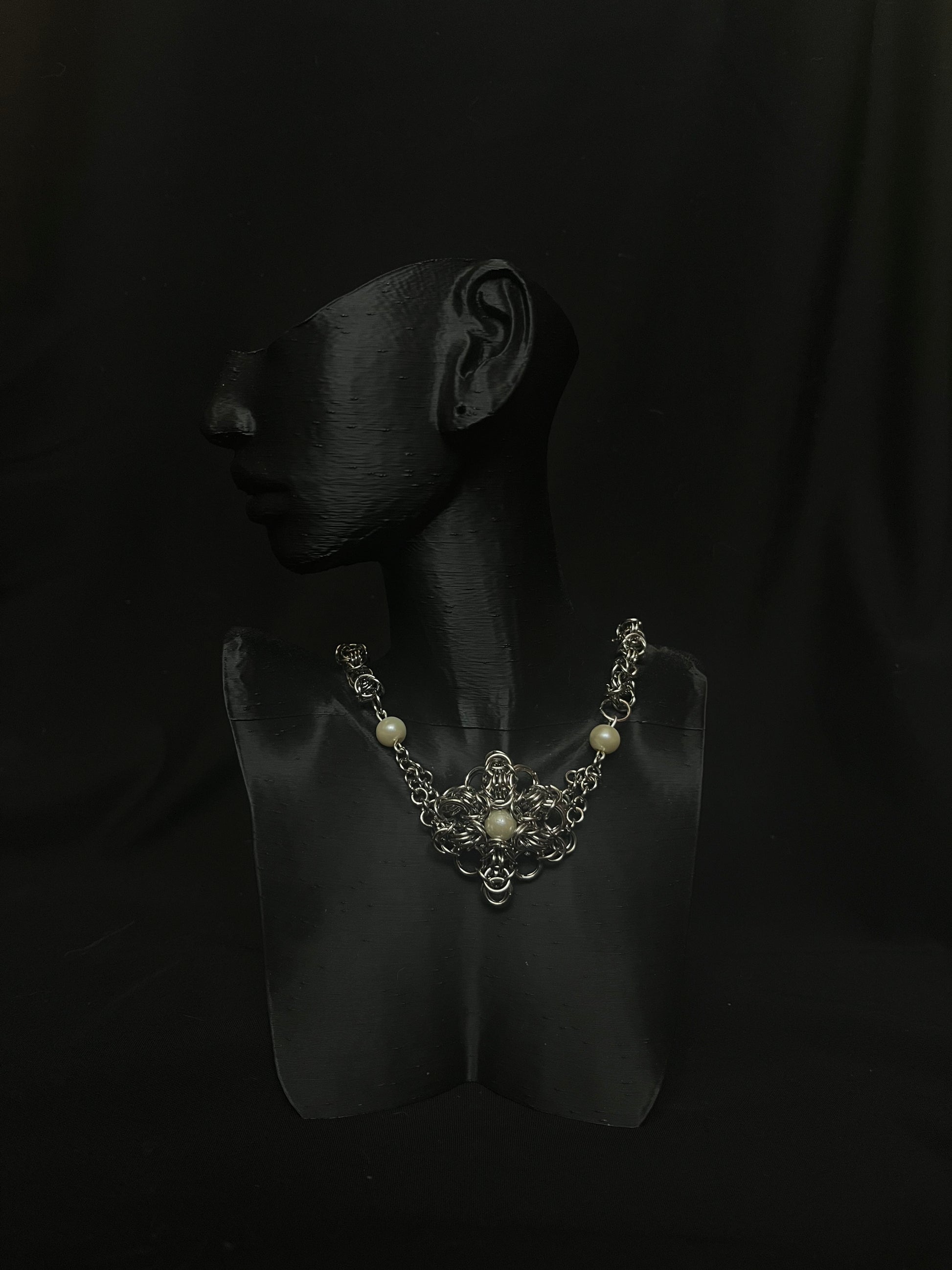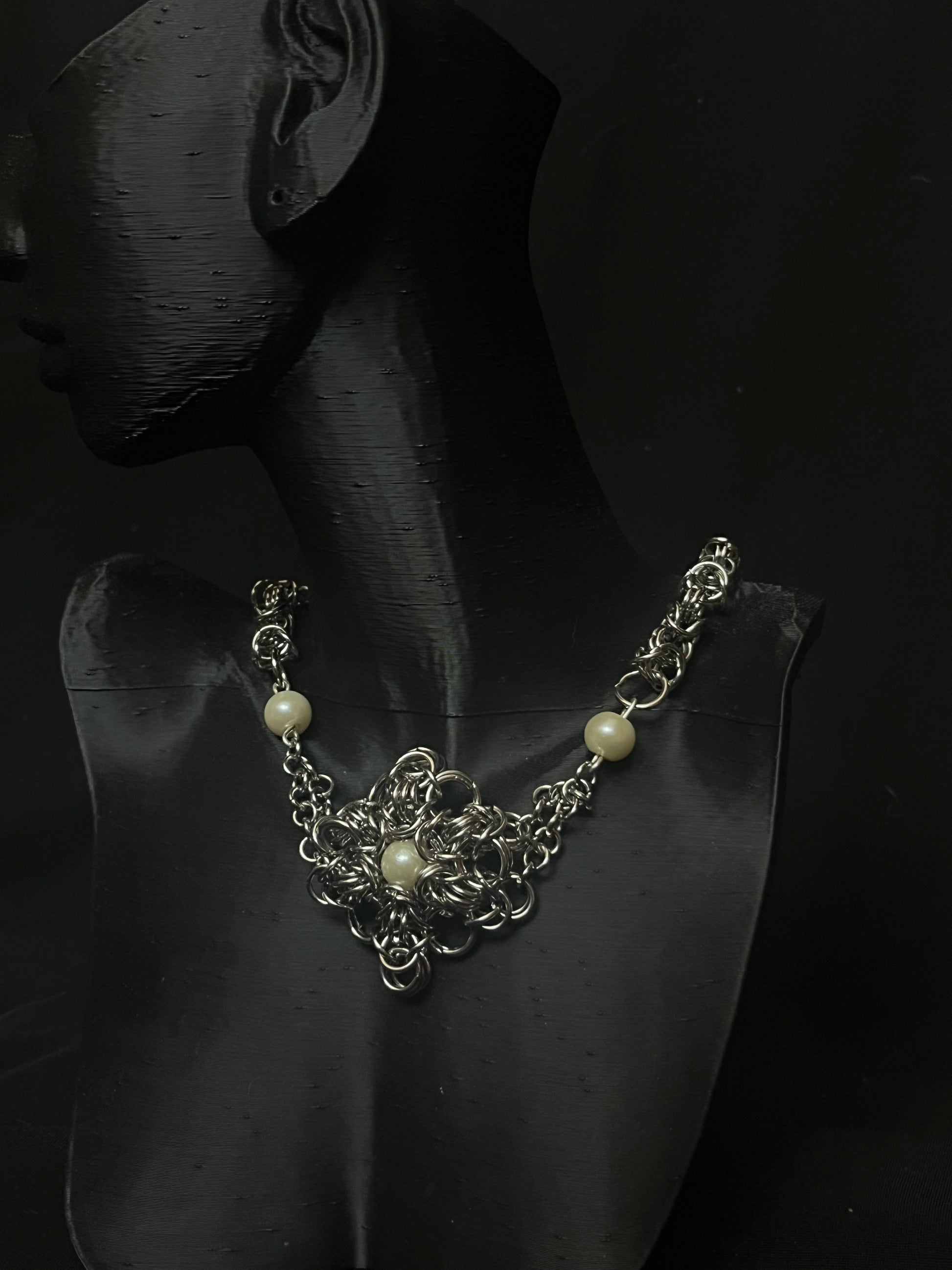 Le Snowflake Choker est un collier unique, entièrement réalisé en acier inoxydable et orné de perles en verre, incarne l’esprit féerique des fêtes de Noël. Sa pièce centrale, un flocon de neige délicatement tissé en maille, est une véritable œuvre d’art qui évoque la magie hivernale. Chaque détail de la chaîne, également façonnée en maille, rappelle la finesse des motifs glacés, offrant une touche élégante et intemporelle à votre tenue.