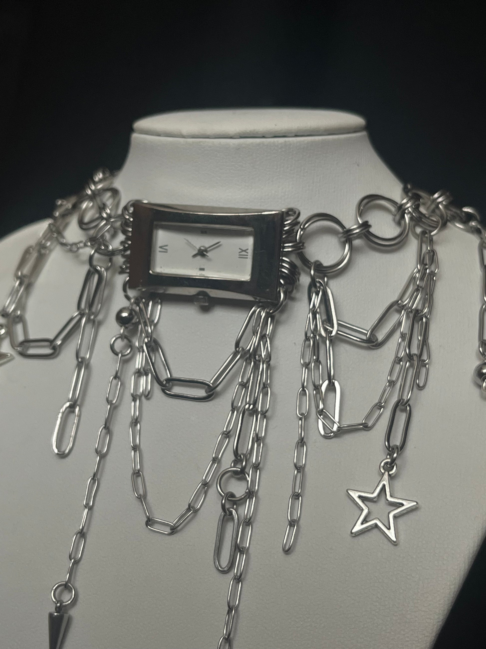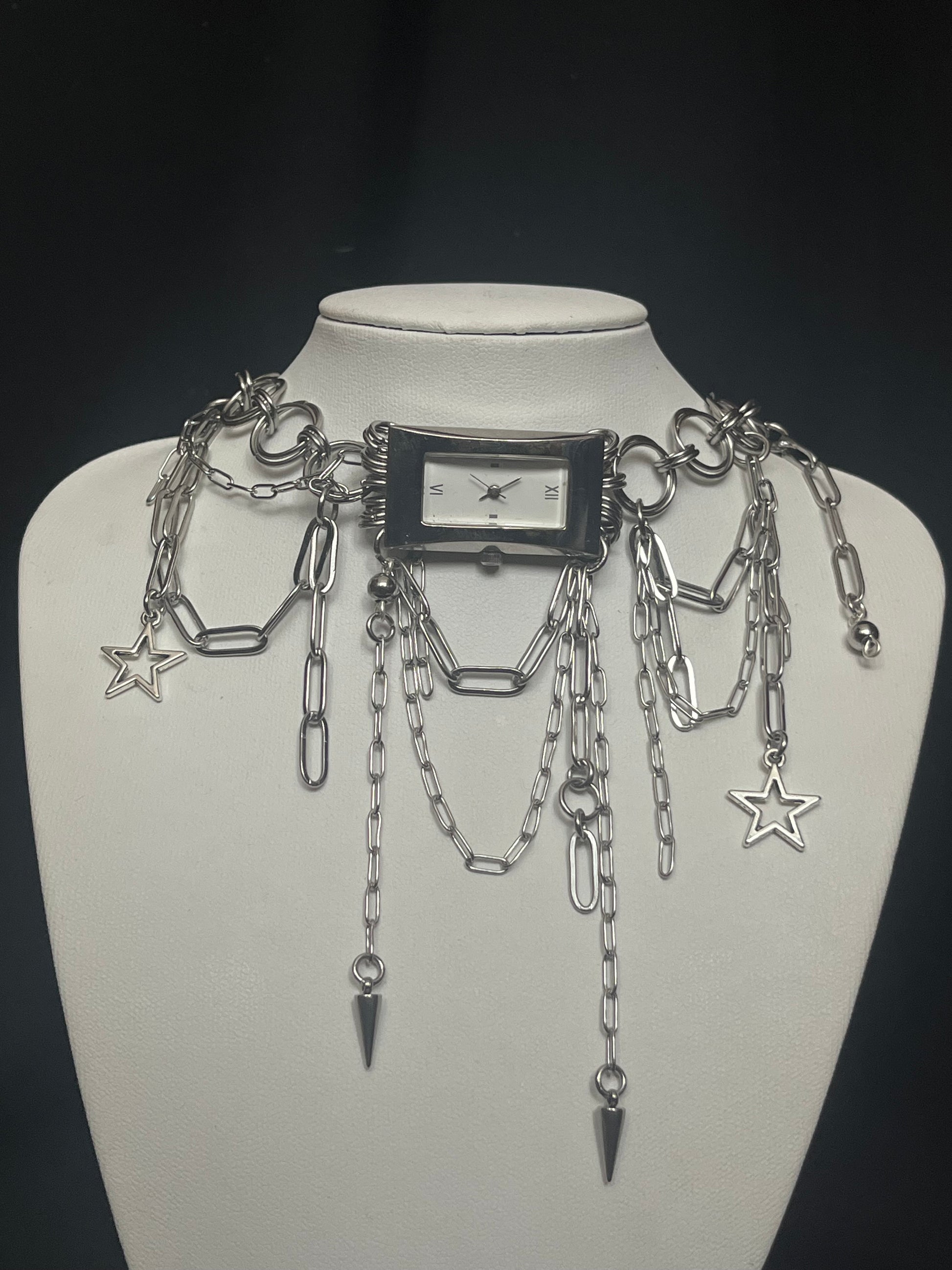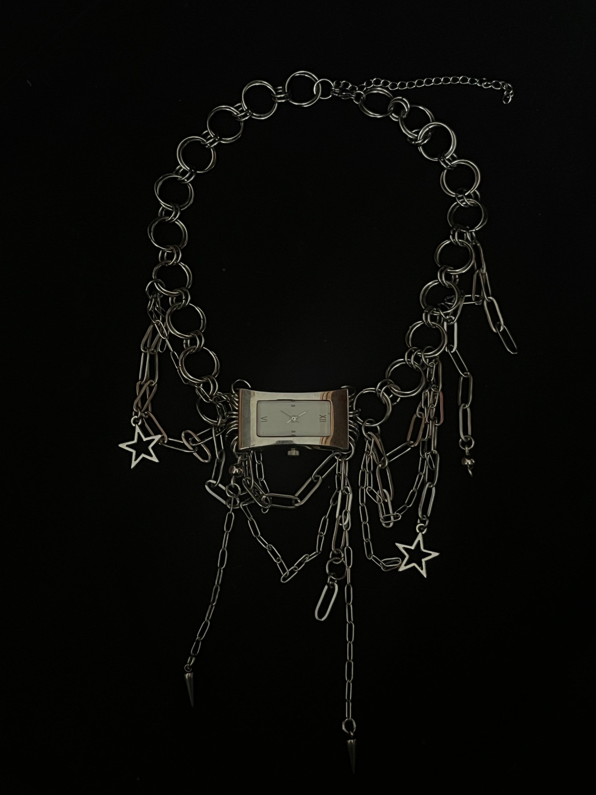 Ce collier au style industriel affirmé est entièrement composé d’acier inoxydable. Ses chaînes robustes, agrémentées de pendentifs étoiles et de pointes métalliques, entourent une montre rectangulaire pour un effet audacieux et moderne. Le design chaotiquement structuré évoque la force brute des matériaux industriels tout en conservant une esthétique unique et contemporaine. Une pièce destinée à ceux qui osent se démarquer.